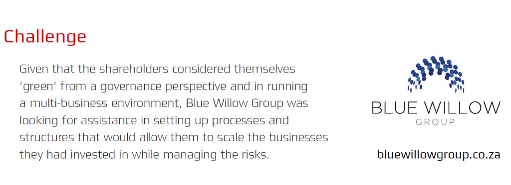 Given that the shareholders considered themselves ‘green’ from a governance perspective and in running a multi-business environment, they were looking for assistance in setting up processes and structures that would allow them to scale the businesses they had invested in while managing the risks.