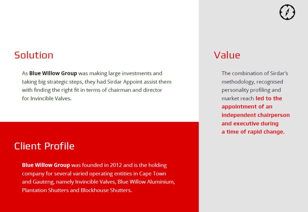 As Blue Willow Group was making large investments and taking big strategic steps, they had Sirdar Appoint assist them with finding the right fit in terms of chairman and director for Invincible Valves.